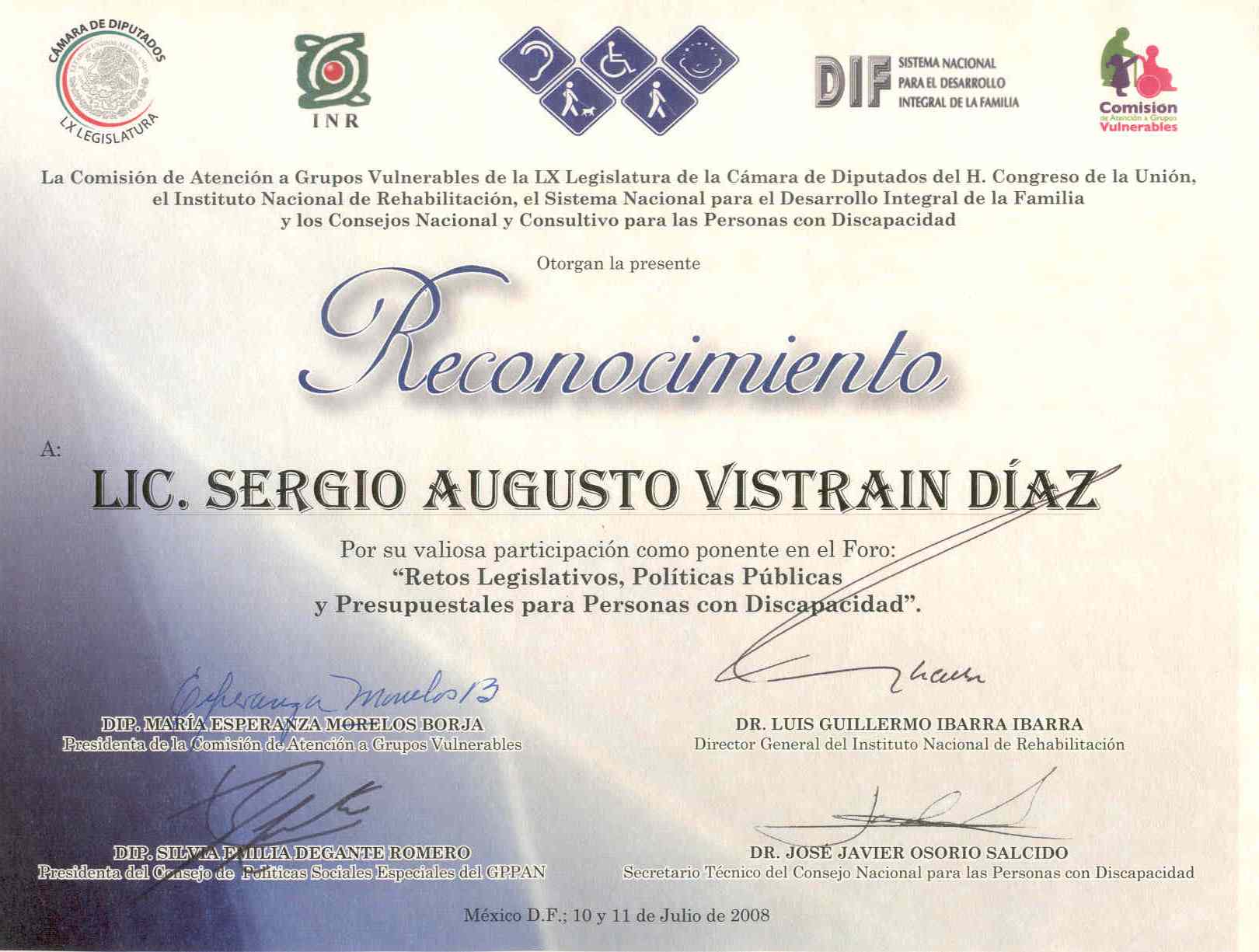 México, D.F., a 12 de julio de 2008. La Comisión de Atención a Grupos Vulnerables de la H. Cámara de Diputados, junto con el Instituto Nacional de Rehabilitación (INR), el Sistema Nacional para el Desarrollo Integral de la Familia (DIF) y los Consejos Nacional para las Personas con Discapacidad y el Consultivo para las Personas con Discapacidad, organizaron el foro "Retos Legislativos, Políticas Públicas y Presupuestales para Personas con Discapacidad", que se llevó a cabo los días 10 y 11 de julio, en el auditorio Nanahuátzin del Instituto Nacional de Rehabilitación, Y al que asistieron legisladores, funcionarios públicos, asociaciones de y para personas con discapacidad, y público en general.