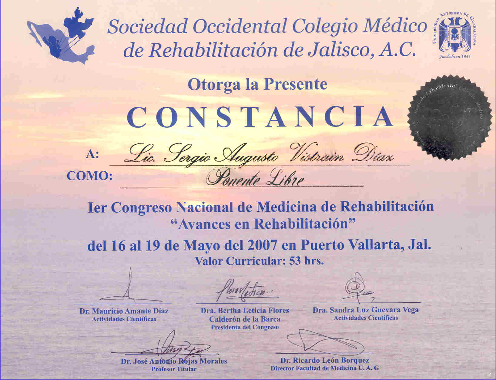 México, D.F., a 19 de mayo de 2007. Del 16 al 19 de mayo de 2007 tuvo lugar, en Puerto Vallarta, Jalisco, el 1er Congreso de Medicina de Rehabilitación “Avances en Rehabilitación”, convocado por la Sociedad Occidental colegio Médico de Rehabilitación de Jalisco, A. C., al que asistieron más 350 médicos de esa especialidad, y en el cual hizo acto de presencia la Organización Mexicana para el Conocimiento de los Efectos Tardíos de la Polio, A. C. (OMCETPAC), presentando el trabajo titulado "El Síndrome Post-Polio; la cuarta etapa en la vida de quienes padecieron la poliomielitis".