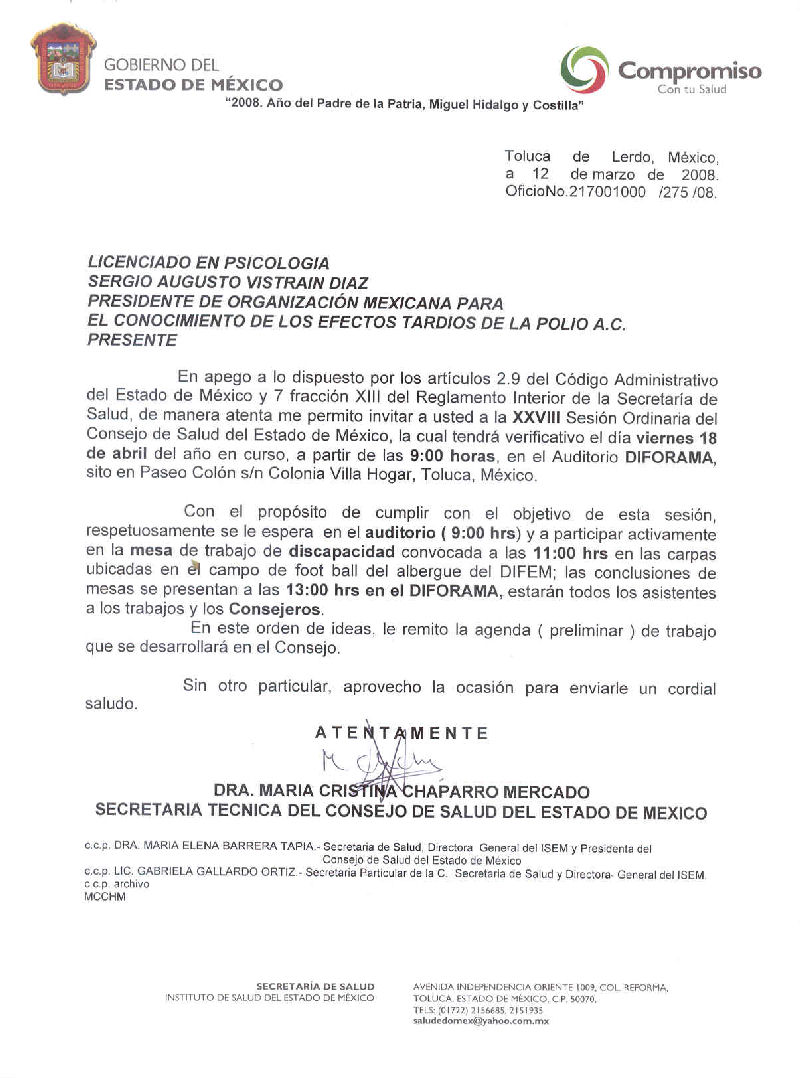 El pasado viernes 18 de abril, en atención a la invitación de la Dra. Ma. Cristina Chaparro Mercado, Secretaria Técnica del Consejo de Salud del Estado de México, la Organización Mexicana para el Conocimiento de los Efectos Tardíos de la Polio, A. C. (OMCETPAC) asistió a la XXVIII Sesión Ordinaria del Consejo de Salud del Estado de México, para participar activamente en la mesa de discapacidad.