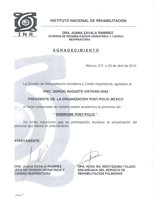 Estrechando los siempre cordiales y fructíferos lazos con el Instituto Nacional de Rehabilitación (INR), y en particular con la “Clínica de Atención Integral en Síndrome Post Polio” de esa importante institución de salud, y atendiendo la amable invitación de la Dra. Rosa María Moctezuma, Encargada del Servicio de Rehabilitación Pulmonar, la Organización Mexicana para el Conocimiento de los Efectos Tardíos de la Polio, A. C. (OMCETPAC), en voz de su presidente, el Lic. Sergio Augusto Vistrain, acudió este 20 de abril de 2010 a una sesión académica convocada por la División de Rehabilitación Geriátrica y Cardio-Respiratoria, para presentar ahí una ponencia sobre el “Síndrome Post-Polio”.